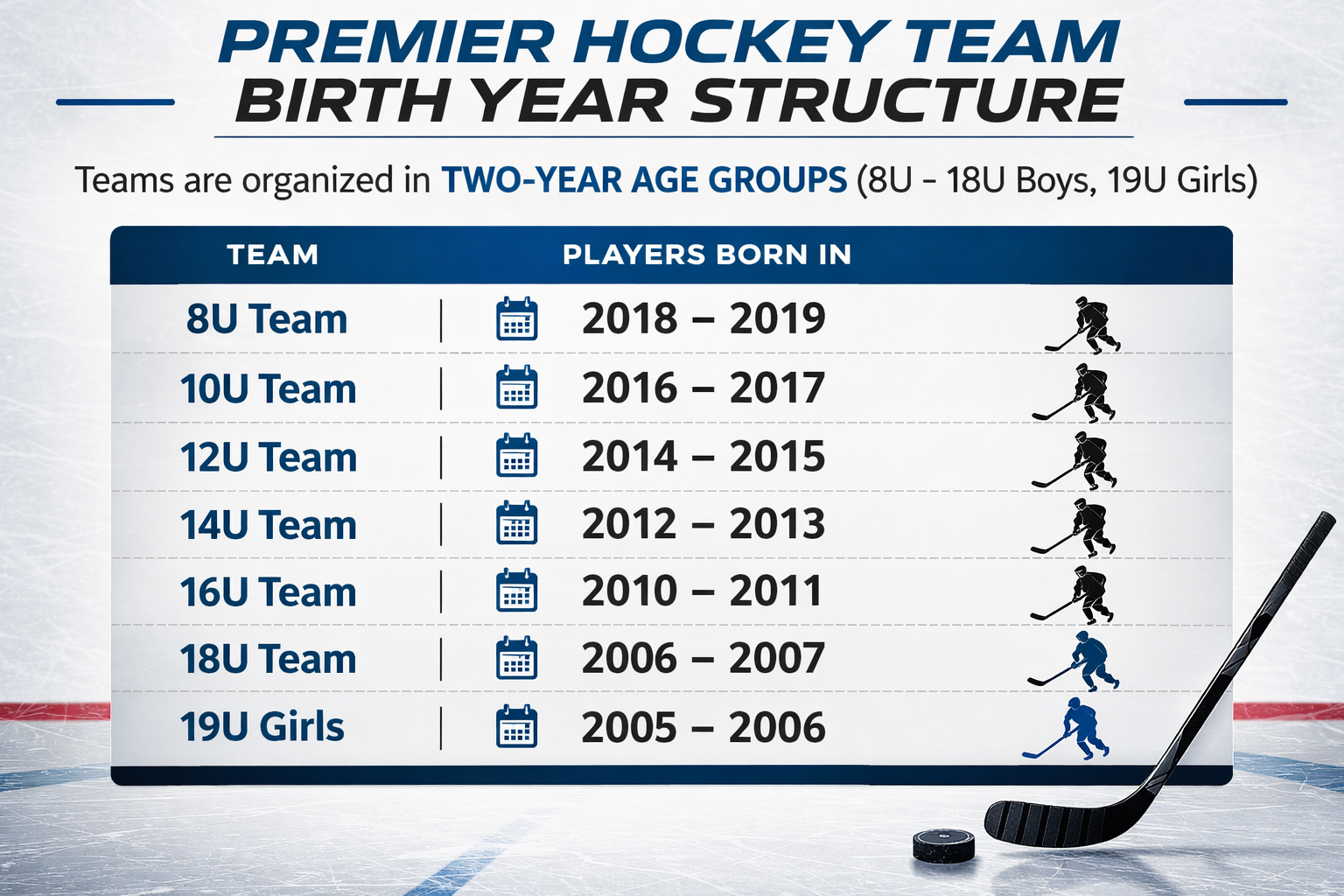 Premier hockey teams are organized by birth year in two-year age groups, ranging from 8U through 18U for boys and 19U for girls. Each team is made up of players born within the designated birth years for that division.